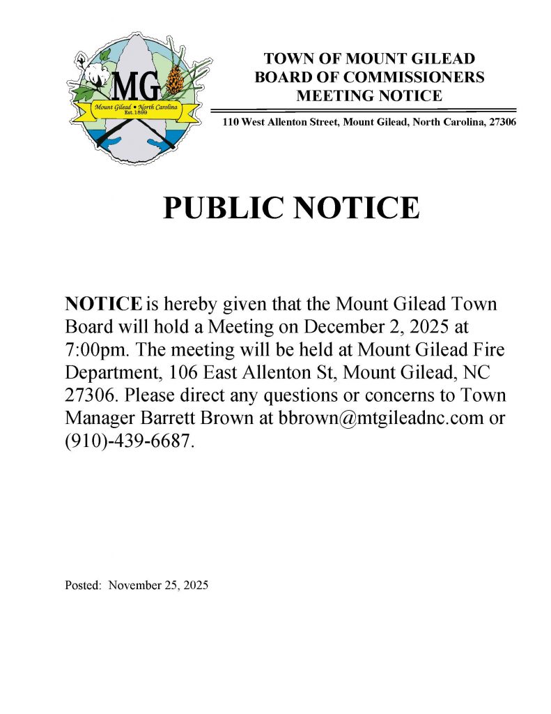 Employment applications available online or apply in person at Mount Gilead Town Hall. Call (910) 210-0951 for more info. Applications accepted until the position is filled. Mount Gilead provides equal employment opportunities to all and prohibits discrimination and harassment of any type without regard to race, color, religion, age, sex, national origin, disability status, genetics, protected veteran status, sexual orientation, gender identity or expression, or any other characteristic protected by federal, state or local laws.