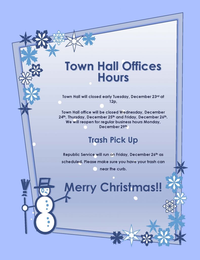 Please be advised that Town Hall will close early on Tuesday and will be closed Wednesday through Friday in observance of the Christmas holiday.